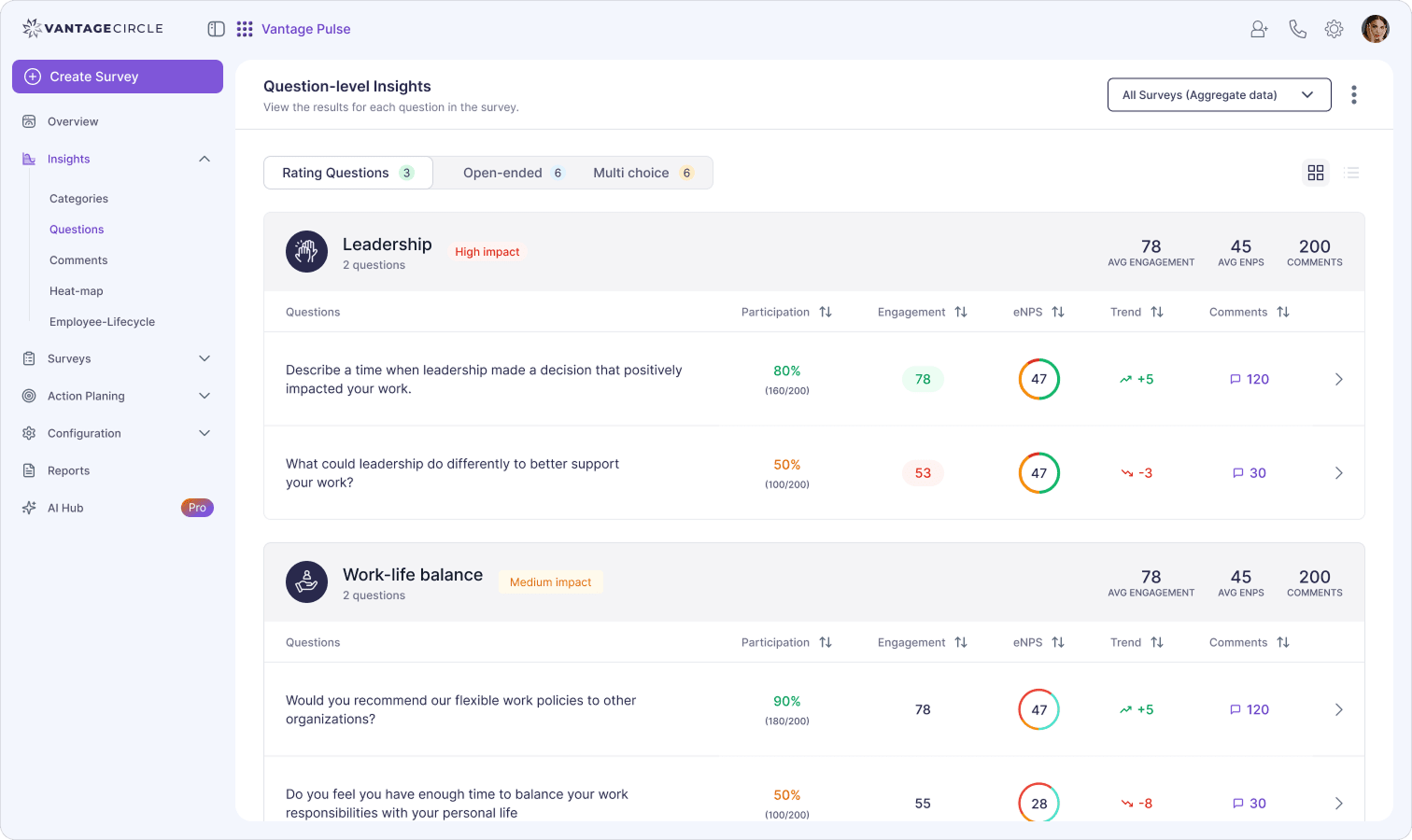 Quarterly or annual engagement surveys are way too slow to get a grip on attrition signals. Instead, you can run short, frequent pulse surveys (monthly or bi-weekly) to track the following: