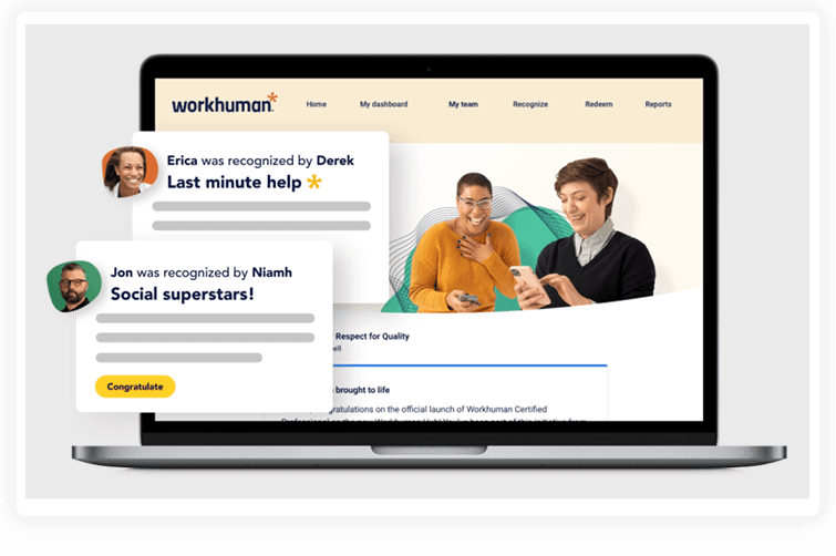 WorkHuman Social Recognition platform helps create a culture of excellence where everyone feels seen, heard, and appreciated for their work. It helps peers and managers participate in continuous recognition activities, boosting work relationships, happiness, and engagement.