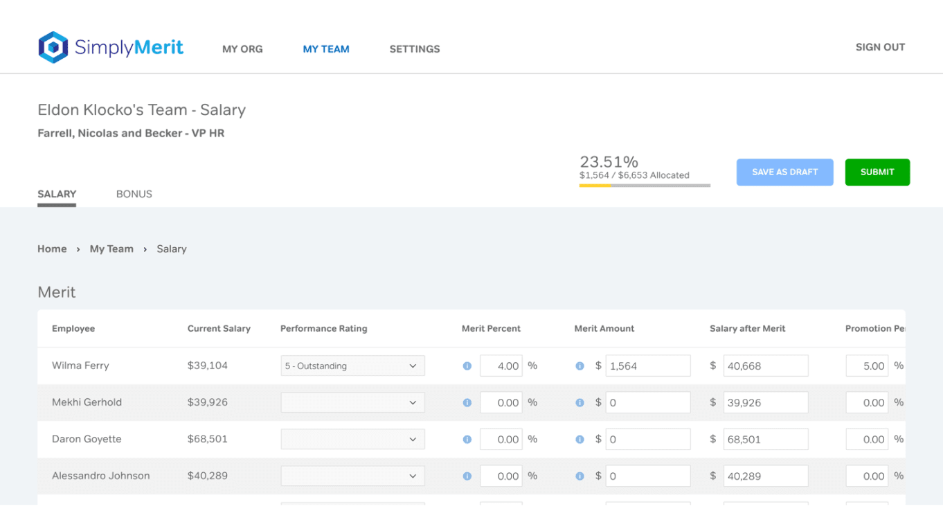 With SimplyMerit, leaders and managers can optimize their merit budgets and annual bonus pools through integrated HR Compensation Management. SimplyMerit handles the currency conversions and applies the automatic prorations as configured by you. The software also manages approval workflow, as well as generating and distributing your adjustment letters.