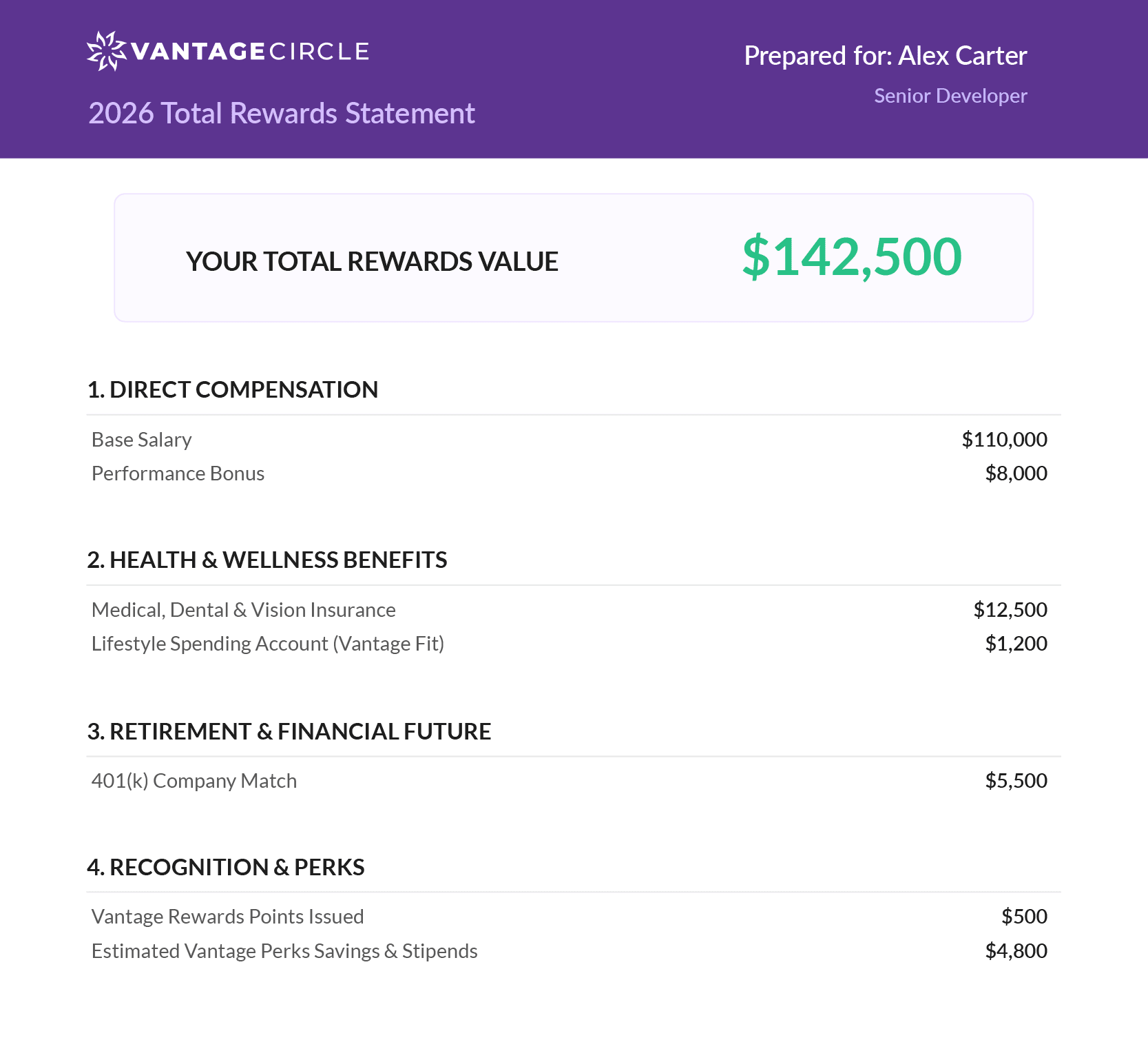 A total rewards statement is a personalized document that gives employees a clear picture of the full financial value of their job. It highlights base pay alongside the hidden monetary value of health insurance premiums, 401(k) matching, wellness stipends, and company-provided perks.