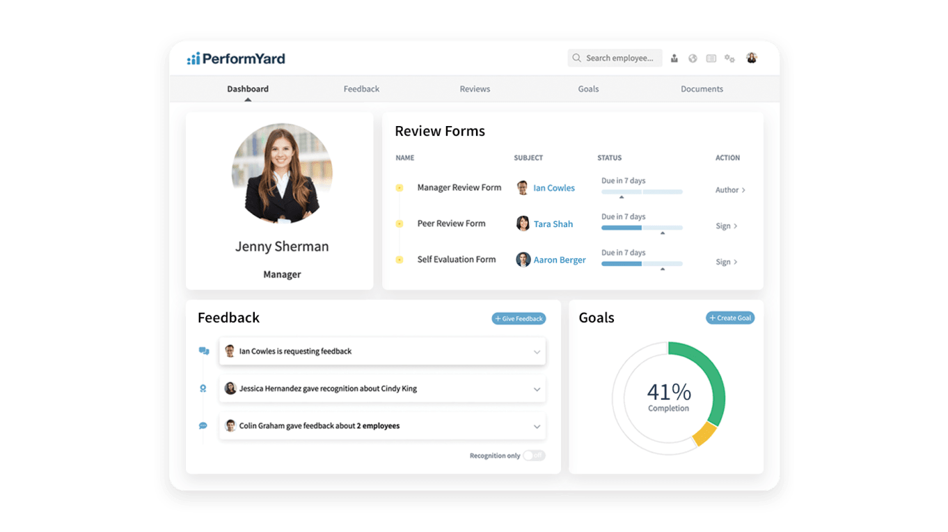 PerformYard es una plataforma de gestión del rendimiento y establecimiento de metas diseñada para capacitar a las organizaciones para alinear, desarrollar y comprometer a sus empleados a través de evaluaciones de rendimiento efectivas y retroalimentación continua.