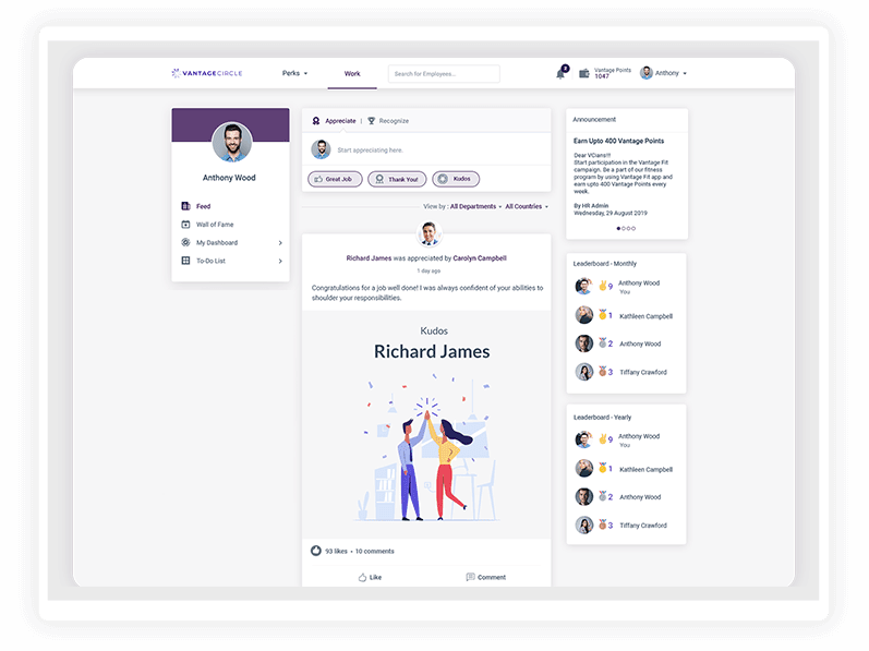 Vantage Circle est une plateforme complète d'engagement des employés et d'avantages sociaux. Elle propose des solutions d'engagement des employés de classe mondiale aux entreprises grâce à ses quatre modules principaux, à savoir Vantage Perks (plateforme d'avantages pour les employés), Vantage Rewards (programme de récompenses et de reconnaissance des employés), Vantage Fit (un programme intégré de santé et de bien-être des employés) et Vantage Pulse, qui est un outil pour mesurer la satisfaction des employés au sein de l'organisation.